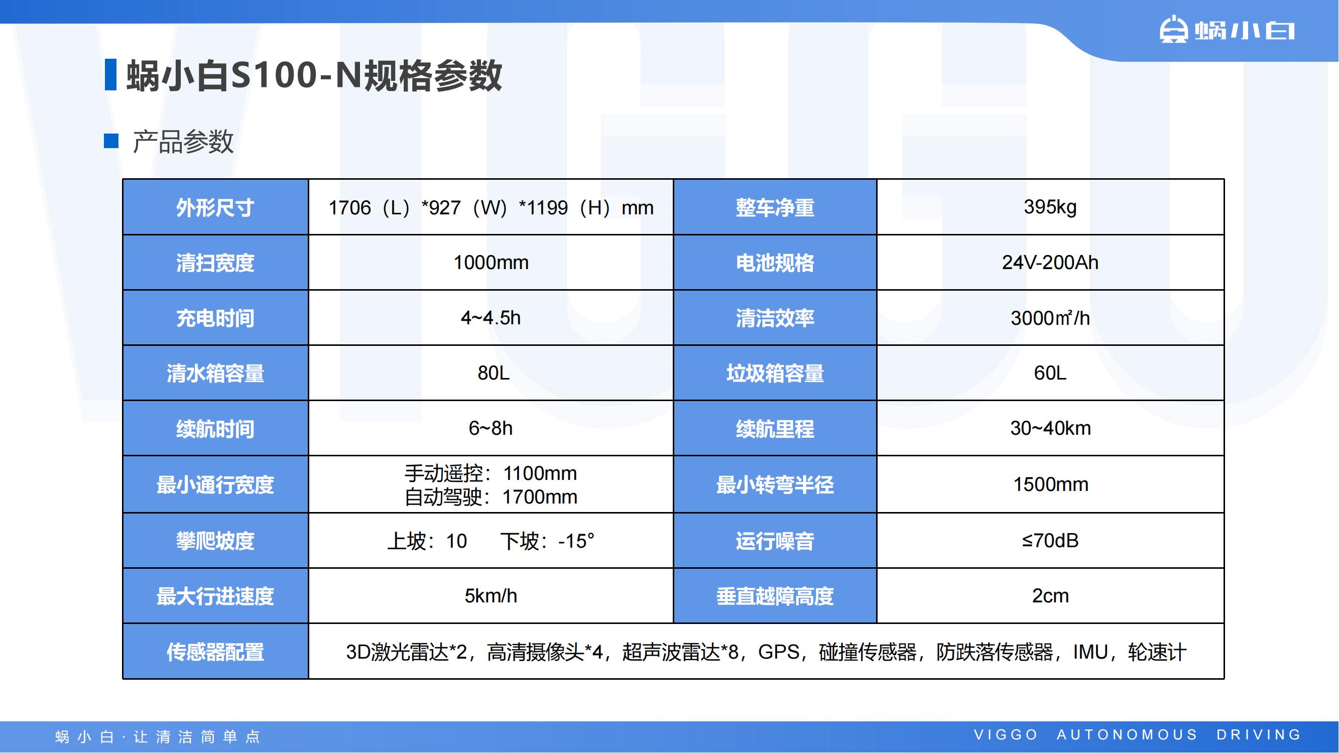 蜗小白S100-N 是一款适用于大型室外场景的无人驾驶清扫车,配备激光雷达、深度相机、超声波雷达等